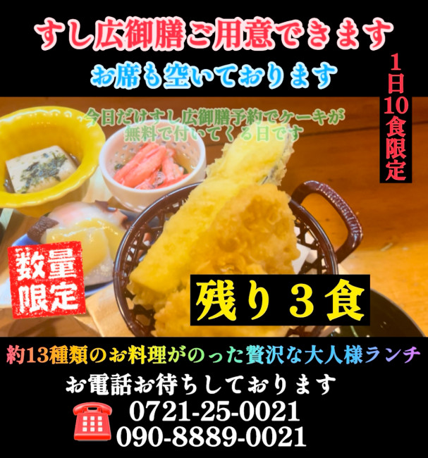 本日、ランチお席若干空いており、すし広御膳もあと少しご用意できます