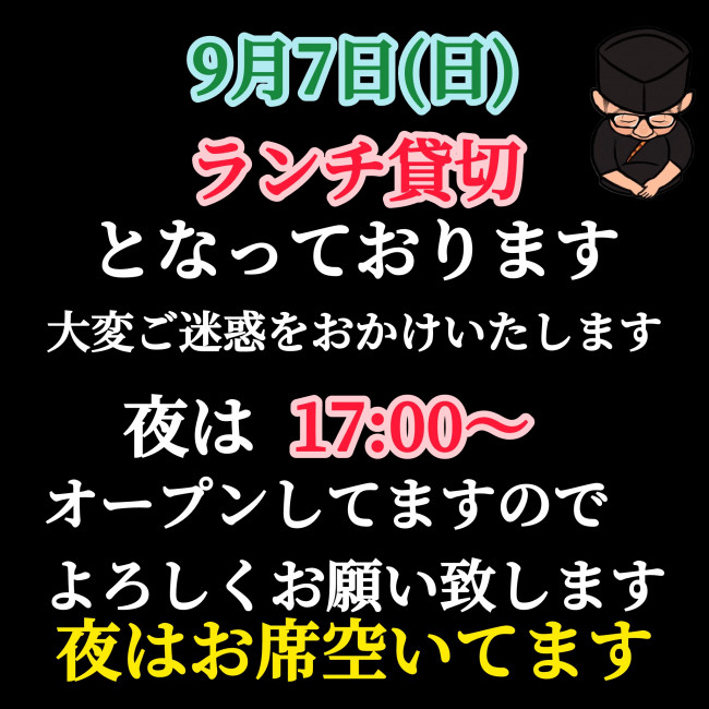 9月7日(日)はランチ貸切営業となりますので