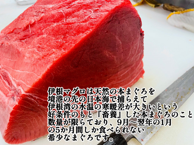 幼魚から育てるのではなく、成魚を取って京都府北部の伊根町のいけすで数カ月間太らせただけで出荷する。 分類上は養殖ですが、水揚げまで9割以上の時間を自然界で過ごす。 中心サイズは100キロ以上で一般的な国産養殖より2倍以上大きい。