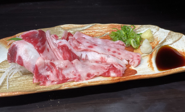 鹿の子(かのこ)とはクジラのアゴを覆っている部位でアゴの付根部分でくじら肉の中で最も美味しい部位と言われて脂があり旨味があります。また、少量しか採れず希少品として取り扱われております。めちゃくちゃ脂あって美味しいです