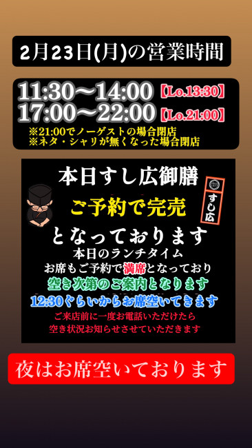 2月23日(月)の営業時間・ランチ空き状況
